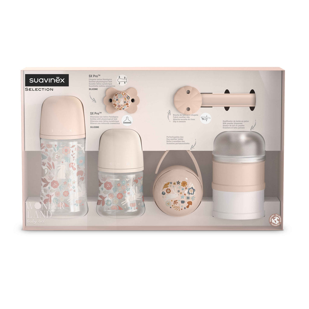 Suavinex Wonderland poklon set roza donosi nježan i praktičan komplet za prve dane s bebom. Usklađeni motivi, dvije bočice, duda i korisni dodaci čine ga idealnim izborom ako tražiš poklon za novorođenče, poklon set za bebu ili praktično rješenje koje pokriva osnovne potrebe za hranjenje i umirivanje.
